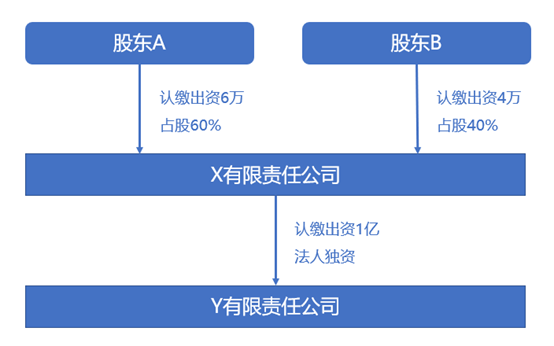 然后再由X有限责任公司出资成立一家Y有限责任公司,认缴1亿元,X公司仅作为控股平台,由Y公司对外经营。