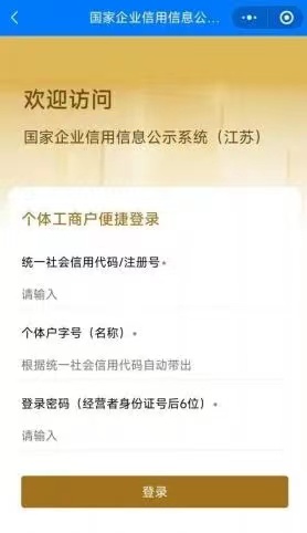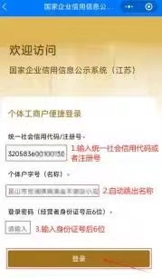 第四步 输入“统一社会信用代码/注册号 ”,会自动带出“个体户字号(名称)”,再输入“登录密码(经营者身份证号后 6 位)”,点击“登录”。